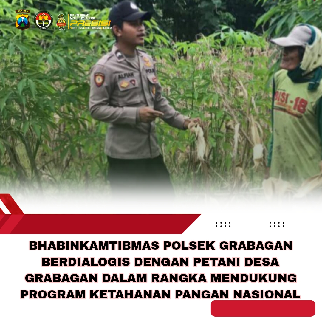 Polri dalam hal ini Polda Jatim khususnya Polres Grabagan mendukung program ketahanan pangan guna mewujudkan swasembada pangan Indonesia. Salah satu upaya nyata diwujudkan melalui kehadiran bhabinkamtibmas Desa Pakis Polsek Grabagan Polres Tuban Polda Jatim melaksanakan kunjungan ke perkarangan milik warga Desa Pakis kecamatan Grabagan Kabupaten Tuban. Kunjungan tersebut dilakukan Bhabinkamtibmas guna mendukung program ketahanan pangan nasional yang dicanangkan pemerintah.