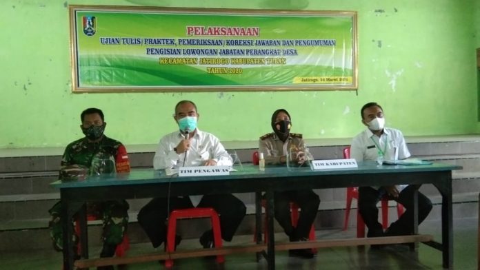 Sebelum pelaksanaan ujian dimulai Kapolsek Jatirogo AKP Elis Suendayati, S.H., menyampaikan kepada seluruh peserta ujian agar tetap menerapkan Protokol Kesehatan 5M dikarenakan pelaksanaan kegiatan ujian ini ditengah Pandemi Covid-19, selain itu agar perserta ujian tidak usah percaya kepada orang yang menawarkan bocoran soal atau jawaban. Seluruh rangkaian soal ujian perangkat desa diawasi ketat untuk menghindari terjadinya percaloan.” Tegas Kapolsek.