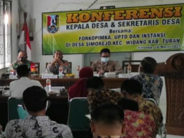 seopini.com-polrestubanpoldajatim Hadir dalam kegiatan Konferensi Kades dan Sekdes se Kecamatan Widang di Desa Simorejo, Kapolsek AKP Totok Wijanarko, S.Pd., sampaikan agar Desa ikut berperan mencegah penyebaran virus Covid’19, Selasa (16/03/2021).