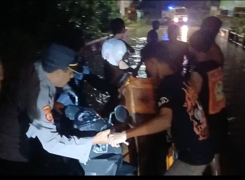 anggotanya membantu warga yang kendaraannya mogok akibat genangan air yang