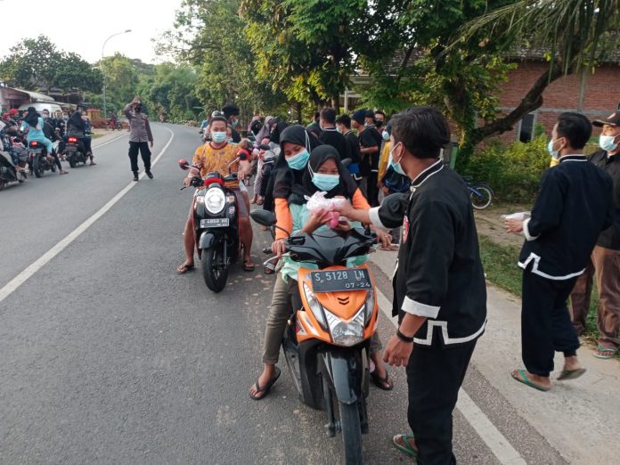 Pembagian takjil yang mendapatkan pengamanan dari personil Polsek Singgahan Polres Tuban tersebut dilakukan dari warga IKSPI Ranting Singgahan dengan membagikan 500 Es Kopyor dan 100 Masker kepada pengendara maupun pengemudi yang melintas di jalan raya Desa Mulyoagung Kecamatan Singgahan Kabupaten Tuban.
