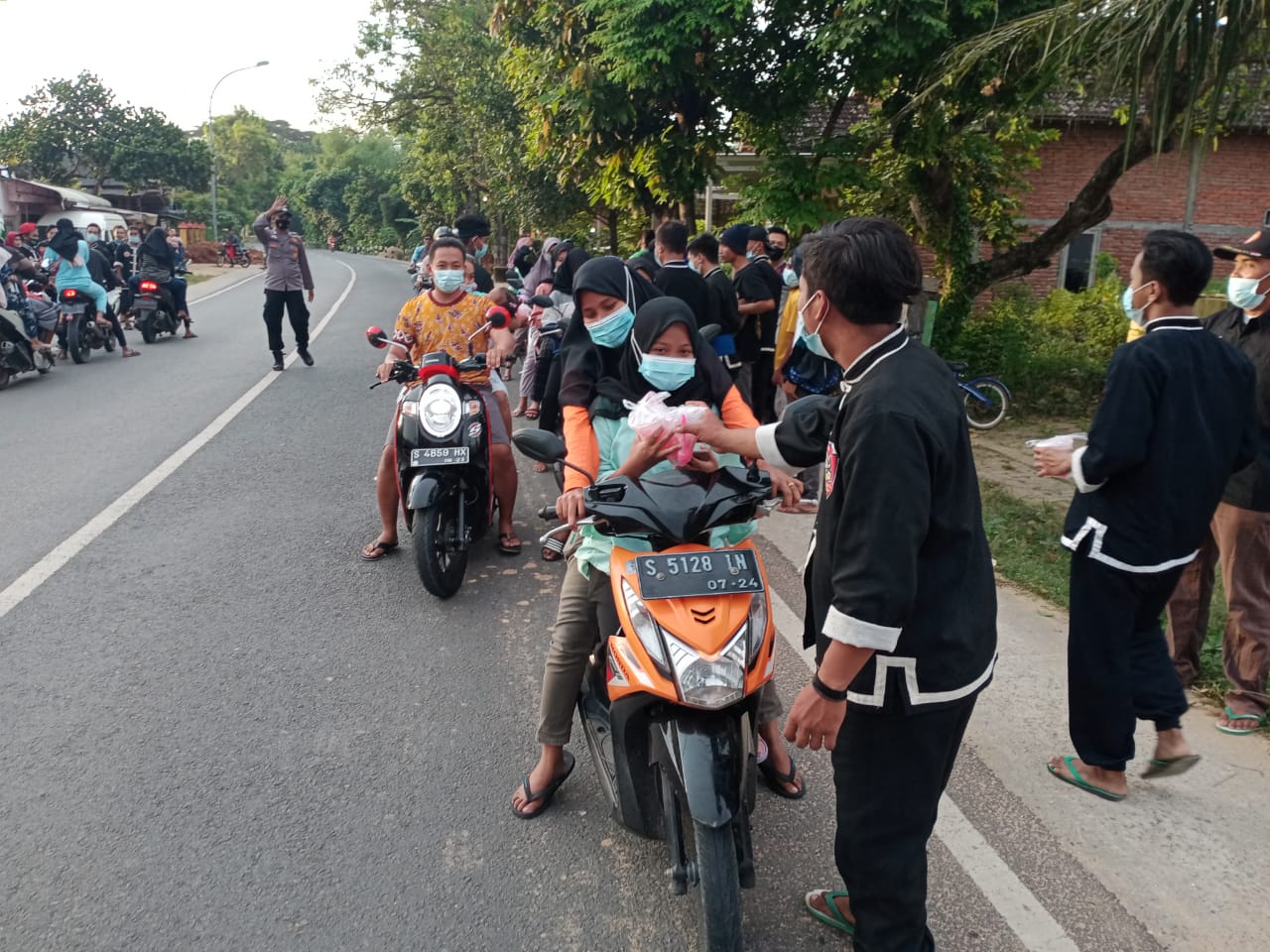 Saat pembagian takjil arus lalu-lintas lumayan ramai karena jalan tersebut merupakan jalur lintas provinsi sehingga saat pembagian tersebut kami juga membatu sambil memberikan himbauan kepada pengendara maupun pengemudi untuk berhati-hati dijalan agar terhindar dari laka lantas.