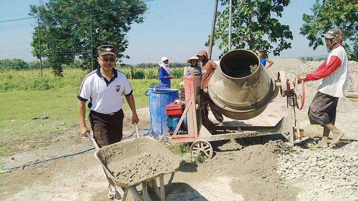 Terpantau di lokasi kerja bakti, Ps Kanit Binmasbersama Babinsa Serda Gunawan bahu membahu bersama dengan warga membawa material bangunan untuk pembangunan lapangan bola voli.