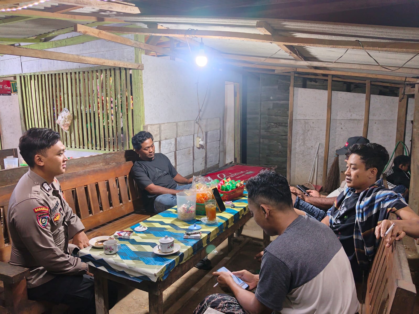Senori – Pelaksanaan patroli Unit Samapta yang Polsek Senori Polres Tuban yang dipimpin oleh Ps Kanit Samapta Aiptu Ahmadi, memberikan himbauan Kamtibmas kepada sekelompok pemuda Desa Sidoharjo yang sedang asik cangkrukan di salah satu warung kopi desa setempat, Senin (9/2/2026) malam.