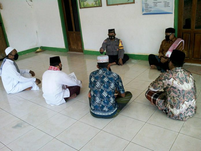 Selesai melaksanakan Sholat Jumat, nampak terlihat Kanit Binmas Aiptu Poniman berdialogis dengan tokoh agama Desa setempat guna sampaikan pesan dan himbauan kamtibmas terkait Protokol kesehatan.