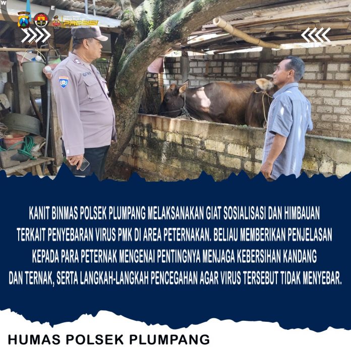 Polsek Plumpang – Kanit Binmas Polsek Plumpang, Aiptu Ngatmin, melaksanakan giat sosialisasi dan himbauan terkait pencegahan penyebaran virus Penyakit Mulut dan Kuku (PMK) di area peternakan wilayah Plumpang. Kegiatan ini bertujuan untuk memberikan pemahaman kepada para peternak mengenai pentingnya menjaga kebersihan kandang dan ternak demi mencegah penyebaran virus PMK.