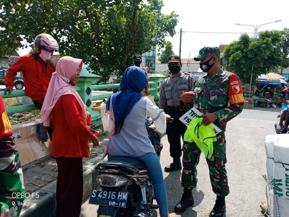 Nampak personil gabungan memantau para pedagang dan pengunjung Pasar dalam penggunaan masker di pintu masuk pasar Bangilan. Bila di dapati ada yang tidak memakai masker dengan benar akan di berikan tindakan hukuman sosial.