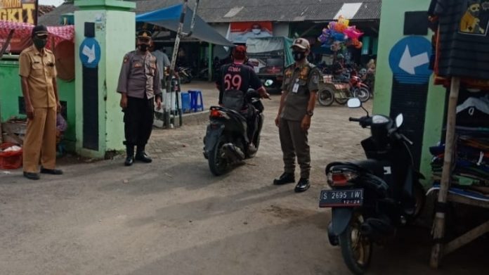 Nampak personil gabungan memantau para pedagang dan pengunjung Pasar dalam penggunaan masker di pintu masuk pasar Bangilan. Bila di dapati ada yang tidak memakai masker dengan benar akan di berikan tindakan hukuman sosial.