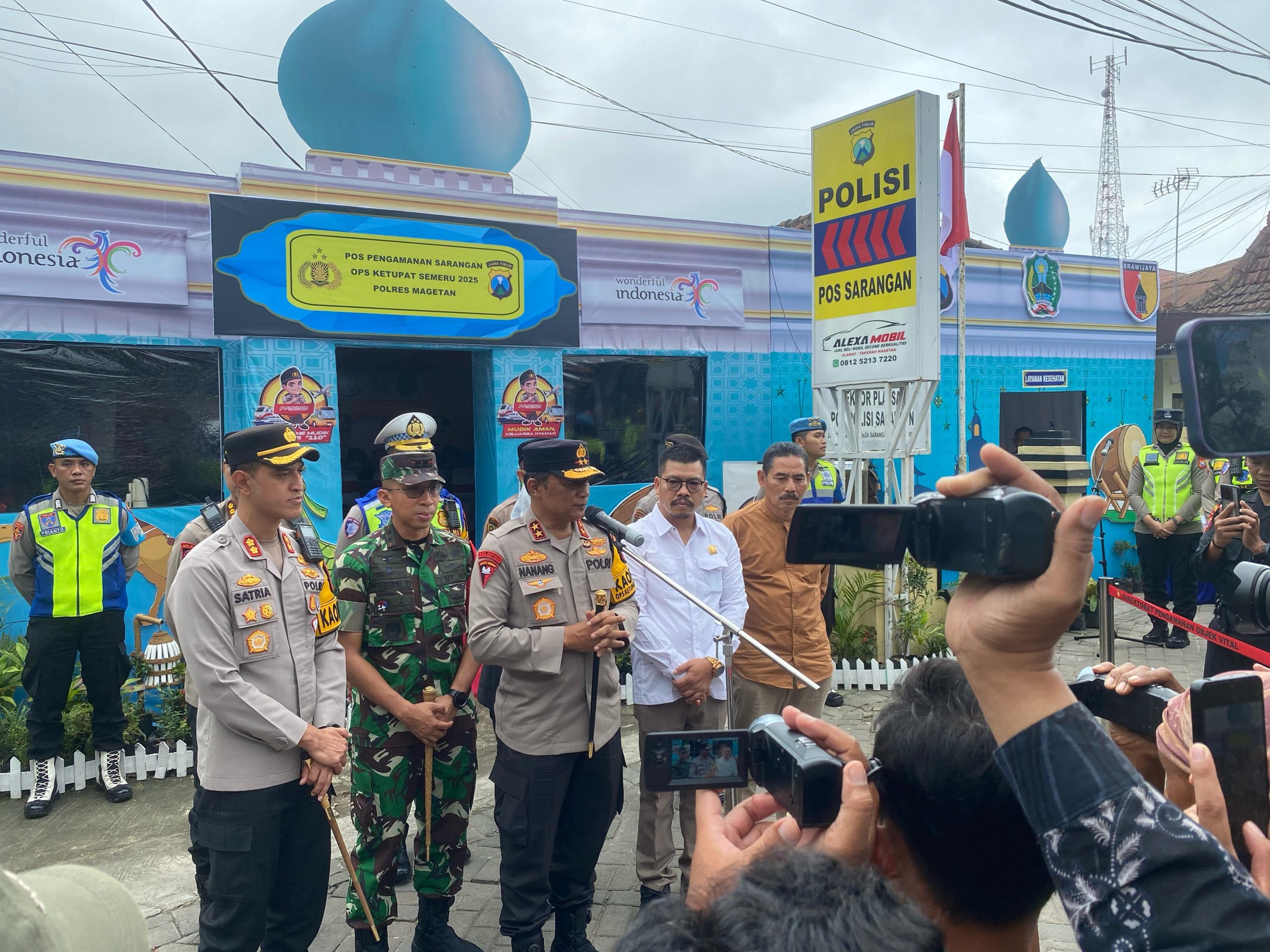 MAGETAN – Kapolda Jawa Timur Irjen Pol Drs Nanang Avianto,M.Si melakukan peninjauan langsung ke objek wisata Telaga Sarangan, Kabupaten Magetan, sekaligus memantau arus balik Lebaran melalui jalur udara, pada Minggu (6/4/2025). Kegiatan ini dilakukan dalam rangka monitoring Operasi Ketupat Semeru 2025 yang saat ini memasuki hari ke-12 dan berada pada fase arus balik.”Hari ini saya melakukan kunjungan ke Sarangan didampingi oleh Forkopimda Magetan untuk memastikan kondisi keamanan dan kenyamanan wisatawan,” ungkap Irjen Pol Nanang Avianto kepada awak media.Kapolda Jatim menjelaskan bahwa pihaknya telah melakukan pemantauan dari ujung Timur yaitu wilayah Kabupaten hingga perbatasan Jawa Timur dengan Jawa Tengah. Irjen Pol Nanang mengungkapkan berdasarkan hasil pantauan, arus mudik maupun arus balik secara umum berjalan aman dan lancar.”Alhamdulillah, berkat kerjasama semua pihak, semuanya berjalan dengan baik. Kegiatan ritual tahunan mulai dari mudik, silaturahmi, dan persiapan kembali ke tempat kerja berjalan dengan lancar,”jelasnya.Dalam pelaksanaan Operasi Ketupat Semeru 2025, Polda Jatim melibatkan total 15.231 personel yang terdiri dari 9.458 personel Polri, 1.404 personel TNI, dan 5.369 personel dari instansi terkait seperti Satpol PP, Dishub, Dinkes, Pramuka, dan lainnya. Sebanyak 204 pos telah disiapkan dengan rincian 149 pos pengamanan, 41 pos pelayanan, dan 13 pos terpadu.Berdasarkan data kunjungan Telaga Sarangan periode 1-5 April 2025, tercatat total pengunjung sebanyak 85.383 orang, menurun dibandingkan periode yang sama tahun 2024 yang mencapai 103.942 orang. “Capaian pengunjung tertinggi terjadi pada tanggal 5 April 2025 dengan 22.365 orang,”kata Irjen Nanang.Data lalu lintas di jalur arteri Magetan-Jawa Tengah periode 23 Maret-5 April 2025 menunjukkan adanya peningkatan kendaraan sebesar 13% untuk kendaraan masuk dan 3% untuk kendaraan keluar dibandingkan tahun sebelumnya. Total kendaraan masuk mencapai 7.309 unit dan kendaraan keluar 7.338 unit.Untuk mengantisipasi kepadatan di area wisata, Polda Jatim menerapkan beberapa strategi pengendalian meliputi patroli di sekitar objek wisata, pemantauan CCTV, patroli di area rawan, rampcheck kendaraan umum, rekayasa lalu lintas, serta penyediaan pos terpadu dan pos pelayanan.”Kami menghimbau kepada masyarakat yang sedang dalam perjalanan arus balik untuk tidak terlalu memaksakan diri jika lelah. Manfaatkanlah pos pengamanan dan pos pelayanan yang kami sediakan untuk beristirahat. Keselamatan adalah prioritas utama,” tegas Kapolda Jatim.Irjen Pol Nanang Avianto juga menyampaikan bahwa meskipun Operasi Ketupat Semeru 2025 berakhir pada 8 April, pihaknya tetap siaga mengantisipasi arus balik bertahap. Ia mengimbau masyarakat untuk tetap menjaga kondisi, tidak memaksakan diri, dan memanfaatkan pos-pos yang tersedia hingga ke perbatasan Jawa Timur-Jawa Tengah.”Sekali lagi saya ucapkan terima kasih kepada semua pihak. Berkat kerjasama yang baik, semuanya bisa berjalan dengan lancar sesuai dengan tagline ‘Mudik Aman Keluarga Nyaman’,” tutup Kapolda Jatim. (*)