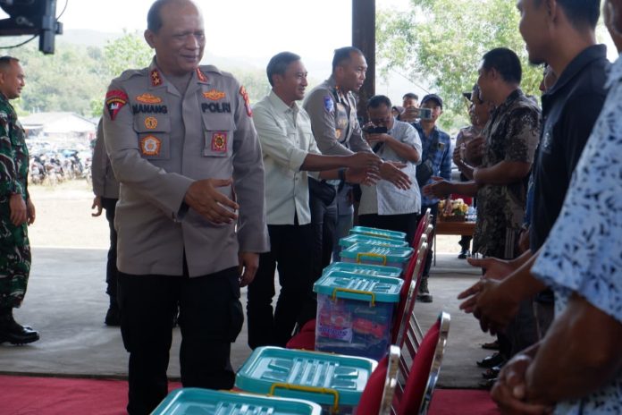 PACITAN – Sebanyak 100 perwakilan nelayan di Tempat Pelelangan Ikan (TPI) Pelabuhan Tamperan, Pacitan menerima bantuan paket sembako dari Kapolda Jawa Timur Irjen Pol Drs Nanang Avianto,M.Si, Jumat (12/9/25).Bantuan tersebut diberikan dalam rangka memperingati Hari Lalu Lintas Bhayangkara ke-70 yang diperingati jajaran Direktorat Lalu Lintas (Ditlantas) Polda Jatim.Penyerahan bantuan dilakukan langsung oleh Kapolda Jatim didampingi Dirlantas Polda Jatim Kombes Pol Iwan Saktiadi, Kapolres Pacitan AKBP Ayub Diponegoro Azhar, Dandim 0801 Pacitan Letkol Arh Imam Musahirul, Bupati Pacitan Indrata Nur Bayuaji beserta Forkopimda. “Ya, bakti sosial, sambil memastikan Kota Pacitan aman kondusif,”ungkap Irjen Pol Nanang usai menyerahkan bantuan sembako.Kapolda Jatim juga mengatakan akan mengunjungi galeri dan museum SBY – Ani.”Mumpung di sini, nanti sekalian mau lihat galeri dan museum SBY–Ani Karena bagaimana pun beliau pernah memimpin bangsa ini,” ujar Kapolda Jatim.Irjen Pol Nanang menyampaikan kesannya terhadap masyarakat pesisir Pacitan yang tampak guyub rukun. “Semua nelayan di Pacitan baik-baik. Nelayan baik-baik semua di sini,” katanya.Sementara itu, Ketua Panitia Bakti Sosial yang juga Dirlantas Polda Jatim, Kombes Pol Iwan Saktiadi, menjelaskan bahwa kegiatan ini bukan sekadar penyerahan bantuan, melainkan sarana mempererat hubungan antara Polri dan masyarakat.“Kami mohon doa agar di usia ke-70 ini Polantas Polri dapat lebih bermanfaat untuk masyarakat. Hadirnya Polri untuk masyarakat betul-betul dapat dirasakan sampai dengan struktur kecil di masyarakat,” ucap Kombes Iwan.Ia menegaskan, tujuan Korlantas Polri adalah menjadi organisasi yang profesional, bermoral, dan modern. Menurut Dirlsntas Polda Jatim itu, dengan kerja sama dan dukungan semua masyarakat tujuan dari Korlantas Polri tersebut bisa terwujud. “Doa seluruh nelayan akan menjadi semangat kami untuk lebih profesional dalam bertugas demi bangsa dan negara,” tambahnya.Dalam kesempatan itu, Kapolres Pacitan AKBP Ayub Diponegoro Azhar menyampaikan apresiasi atas kehadiran Kapolda Jatim dan jajaran. Menurutnya, kunjungan ini merupakan bentuk perhatian nyata Polri kepada masyarakat pesisir.“Kehadiran Bapak Kapolda Jatim dan jajaran merupakan suatu kehormatan sekaligus wujud perhatian nyata bagi masyarakat Pacitan, khususnya para nelayan yang merupakan salah satu pilar penting dalam menjaga ketahanan pangan daerah,” ucap AKBP Ayub.Ia menambahkan, bakti sosial ini tidak hanya sekadar perayaan ulang tahun, tetapi memberikan manfaat langsung kepada masyarakat.Ia berharap kegiatan kali ini dapat mempererat hubungan Polri dan masyarakat serta meningkatkan kesadaran tentang pentingnya keselamatan di jalan raya. “Kami berharap ini menjadi pengingat bagi kita semua untuk terus meningkatkan pelayanan, pengabdian, serta pengayoman kepada masyarakat sesuai dengan semangat Polri Presisi,” tandas AKBP Ayub.Di sisi lain, para nelayan yang menerima bantuan merasa terbantu dengan adanya kegiatan sosial tersebut. Salah satunya, Eko Setyono, mengucapkan terima kasih atas perhatian yang diberikan.“Terima kasih kepada Kapolda Jatim dan rombongan. Bantuan ini sangat bermanfaat bagi kami nelayan,” ujar Eko.Kegiatan bakti sosial dalam rangka Hari Lalu Lintas Bhayangkara ke-70 ini menjadi momentum penting bagi Polri untuk mendekatkan diri dengan masyarakat. Tak hanya sebatas seremoni, acara ini diharapkan mampu memperkuat ikatan sosial dan menegaskan peran Polri dalam melayani serta melindungi masyarakat di semua lapisan. (*)