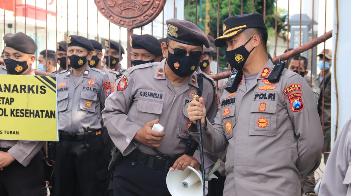 Terlihat Kapolres Tuban AKBP Ruruh Wicaksono, S.I.K., S.H., M.H., ikut memantau pelaksanaan aksi unjuk rasa tersebut.
