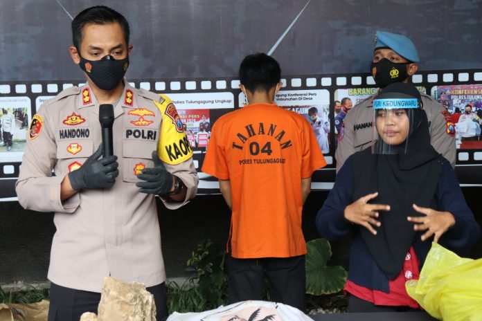 seopini.com – TULUNGAGUNG – Kapolres Tulungagung AKBP Handono Subiakto SH, SIK, MH Didampingi Kasat Reskrim AKP Christian Kosasih SIK menggelar Kkonferensi Pers Ungkap Kasus Pembunuhan TKP JLS yang terjadi pada Hari Kamis (29/4/2021)