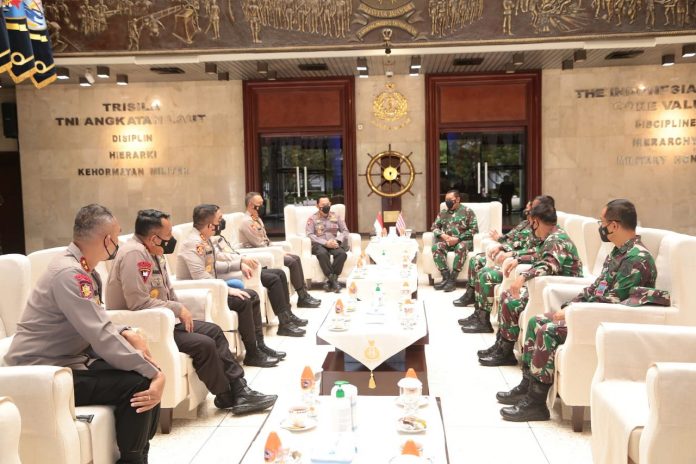 JAKARTA – Kapolri Jenderal Listyo Sigit Prabowo menyambangi Kepala Staf Angkatan Laut (KSAL) Laksamana TNI Yudo Margono di Mabes TNI AL, Cilangkap, Jakarta Timur, Senin (22/3/2021).