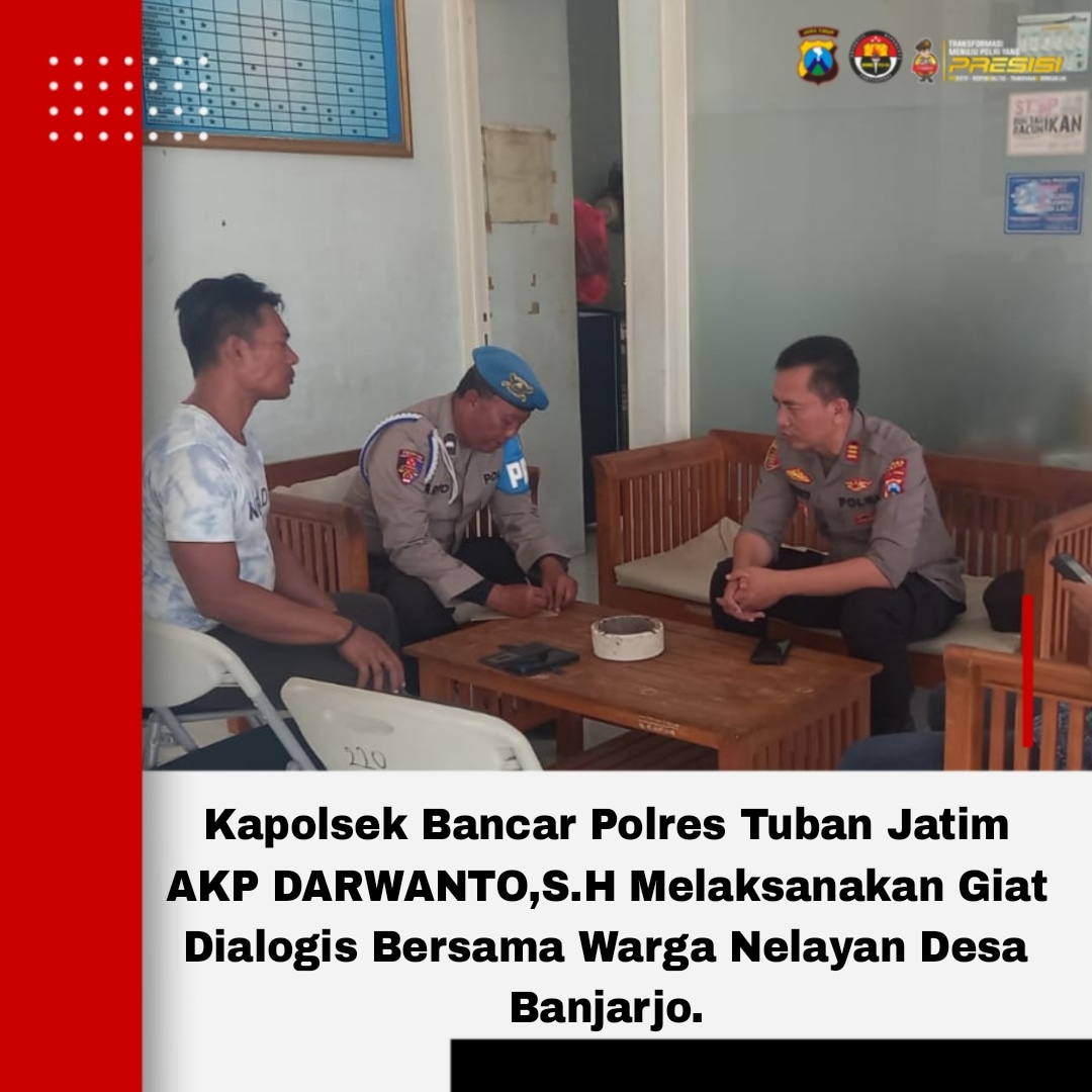 Kapolsek Bancar Polres Tuban Jatim Melaksanakan Giat Dialogis Bersama Warga Nelayan Desa Banjarjo Terkait cuaca yang buruk akhir-akhir ini.