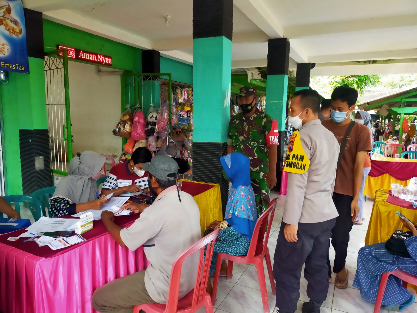 Kegiatan tersebut dipimpin oleh Kapolsek Bangilan AKP Budi Gunawan S.PD, Selain membagikan masker, sejumlah personel juga terlihat berikan himbauan ayo pakai masker pada pengunjung pasar serta memeriksa baik pengunjung maupun pedagang yang belum Vaksin langsung di laksanakan Vaksinanasi di tempat.