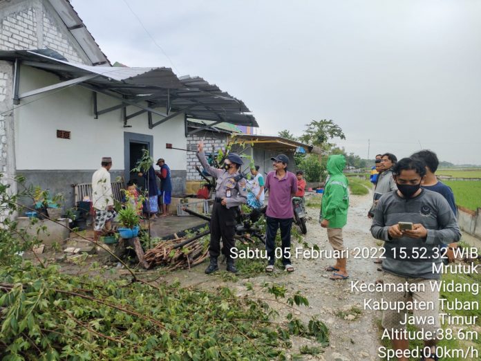 Widang – Sabtu, 05 Februari 2022 Pukul 13.00 Wib., Di desa Mrutuk Kecamatan Widang Kabupaten Tuban telah terjadi angin puting beliung yang menerpa rumah rumah warga RT 02 RW 03 Desa Mrutuk Kecamatan Widang yang mengakibatkan genteng dan kanopi rumah warga rusak.