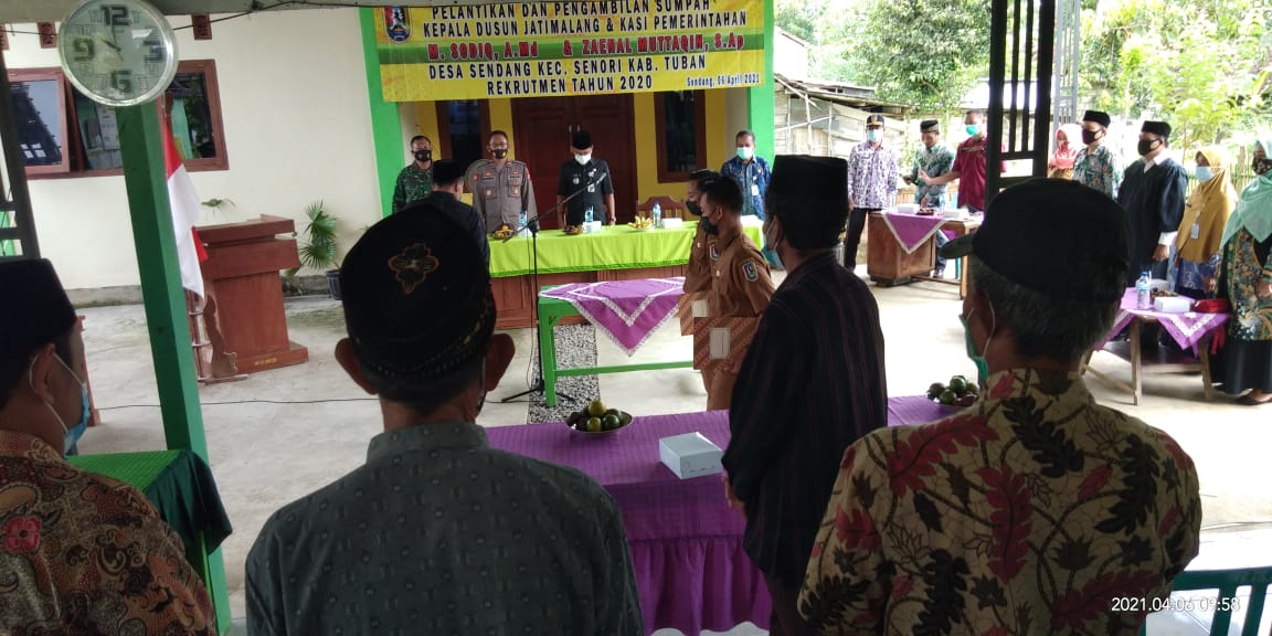 seopini.com – PolresTubanJatim Kapolsek Senori Polres Tuban Iptu Suganda, S.H., menghadiri kegiatan pelantikan Perangkat Desa Sendang Kec, Senori. Dimana pada waktu tersebut M. Sodiq dilantik sebagai Kadus Jatimalang dan Zaenul Mutaqqin sebagai Kaur Tata Usaha dan Umum Desa Sendang, Kecamatan Senori, Selasa (6/4/2021)