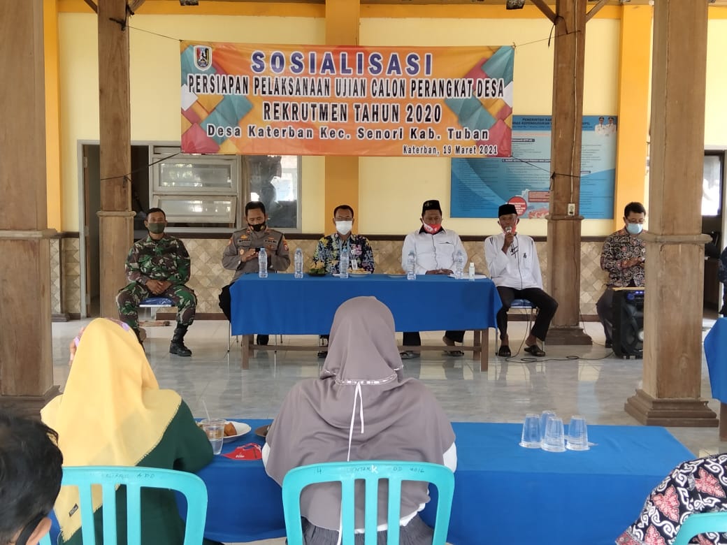 Senori-Pemerintah Desa Katerban bekerjasama dengan Pemerintah Kecamatan Senori Kabupaten Tuban melaksanakan sosialisasi persiapan ujian Calon Perangkat Desa di Balai Desa setempat, Jum’at (19/3/2021).