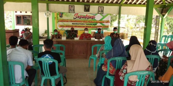 seopini.com-polrestubanpoldajatim Pemerintah Desa Sendang bekerjasama dengan Pemerintah Kecamatan Senori Kabupaten TubanĀ  melaksanakan sosialisasi persiapan ujian Calon Perangkat Desa di Balai Desa setempat, Kamis (18/3/2021).
