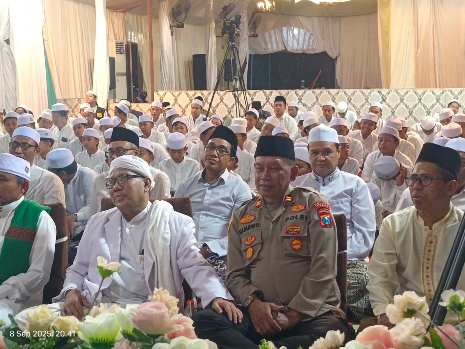 Senori – Kapolsek Senori Polres Tuban Polda Jatim Iptu Sudjarwo, S.H., menghadiri kegiatan pengajian umum dalam rangka peringatan Maulid Nabi Muhammad SAW dan Harlah ke 23 Ponpes Al Husna Al Alawi di Desa Jatisari Kec, Senori, Rabu (10/9/2025) malam.