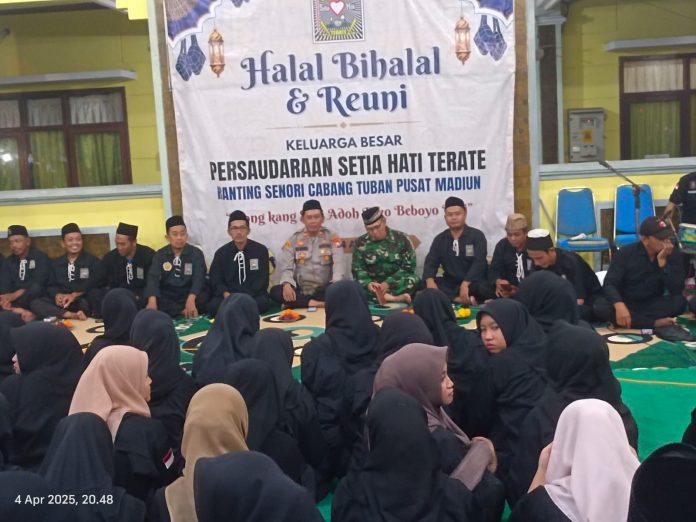 Senori – Kapolsek Senori Polres Tuban Polda Jatim Iptu Sudjarwo, S.H., memimpin personil Polsek Senori melaksanakan pengamanan kegiatan halal bihalal dan reuni dari perguruan silat PSHT Ranting Senori Cabang Tuban pusat Madiun di Pendopo Kecamatan Senori, Jumat (4/4/2025) malam.