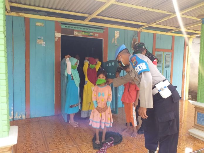 Pada kegiatan patroli sambang tersebut Aipda Ahmadi dan Serda Subiyanto memberikan himbauan kepada anak -anak yang sedang berkumpul untuk menggunakan Masker dan selalu mencuci tangan, Jum’at (9/4/2021).