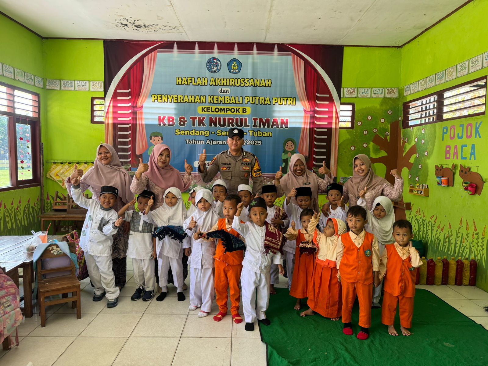 Kegiatan tersebut berlangsung di KB dan Nurul Iman Desa Sendang Kecamatan Senori, yang diikuti oleh para siswa dan para guru. Tidak ketinggalan pada kesempatan tersebut anggota Bhabinkamtimas membagikan sarana kontak Bhabinkamtimas berupa sajadah kepada ibu guru dan anak-anak.