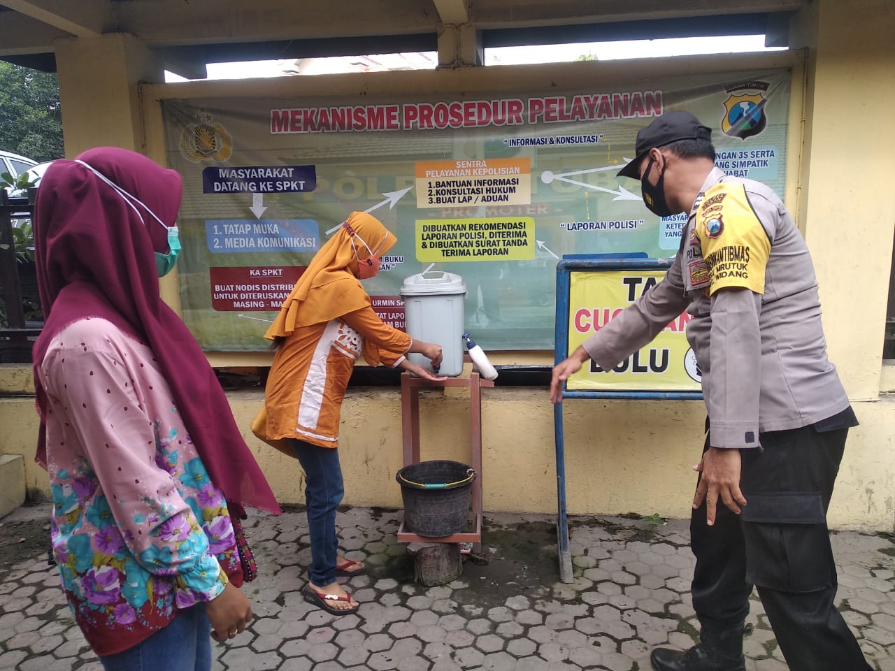 ” Disamping wajib mengenakan masker, kepada warga masyarakat yang berkunjung ke Kantor Polsek juga kita edukasi penerapan protokol kesehatan 5-M diantaranya dengan mencuci tangan, ” ucap Aiptu Febri yang tengah mengarahkan warga, Selasa (16/03/2021).