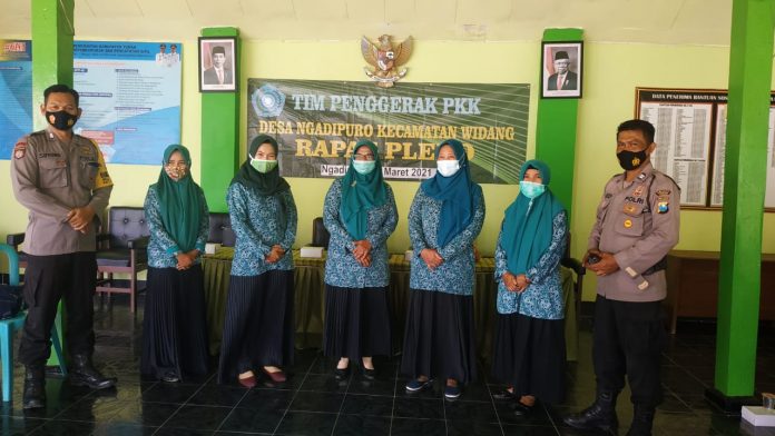 seopini.com-polrestubanpoldajatim Dalam rangka menumbuhkan kesadaran partisipasi masyarakat terhadap Kamtibmas dan juga Program Pemerintah penerapan Protokol Kesehatan 5-M, pada hari Senin (22/03/2021) Bhabinkamtimas Polsek Widang Aiptu Agung Tri Edy bersama Bripka Suyono melaksanakan kegiatan Binluh kepada Ibu PKK di Desa Ngadipuro.