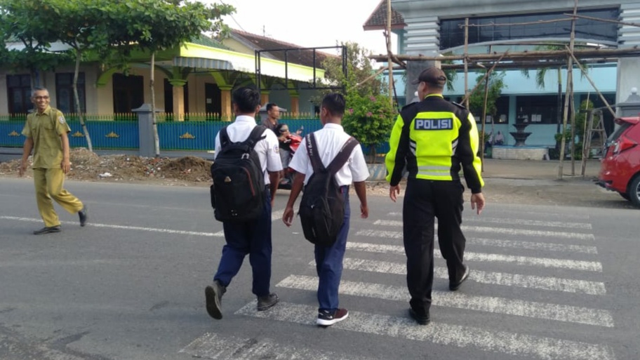 Sambil melakukan pengaturan, Bripka Sumindar anggota Polsek Jatirogo Polres Tuban juga menyeberangkan para siswa siswi yang sedang berjalan kaki berangkat menuju sekolah, selain itu petugas juga menghimbau kepada pengguna jalan agar mematuhi peraturan dan rambu-rambu lalu lintas yang ada.
