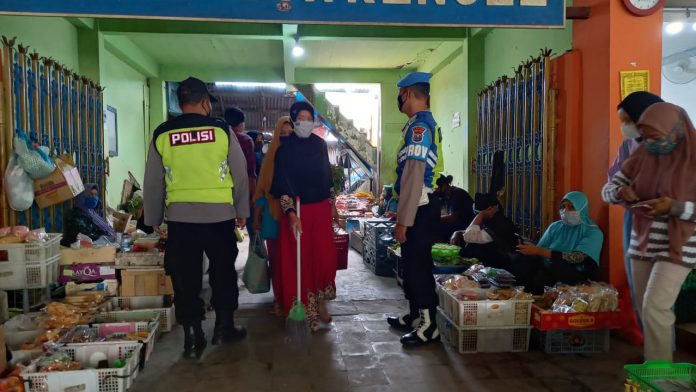 Anggota Kepolisian Sektor Rengel Polres Tuban menggelar patroli jalan kaki dan dialogis di Pasar Desa Rengel Kecamatan Rengel Kabupaten Tuban. Sabtu, (01/05/2021).