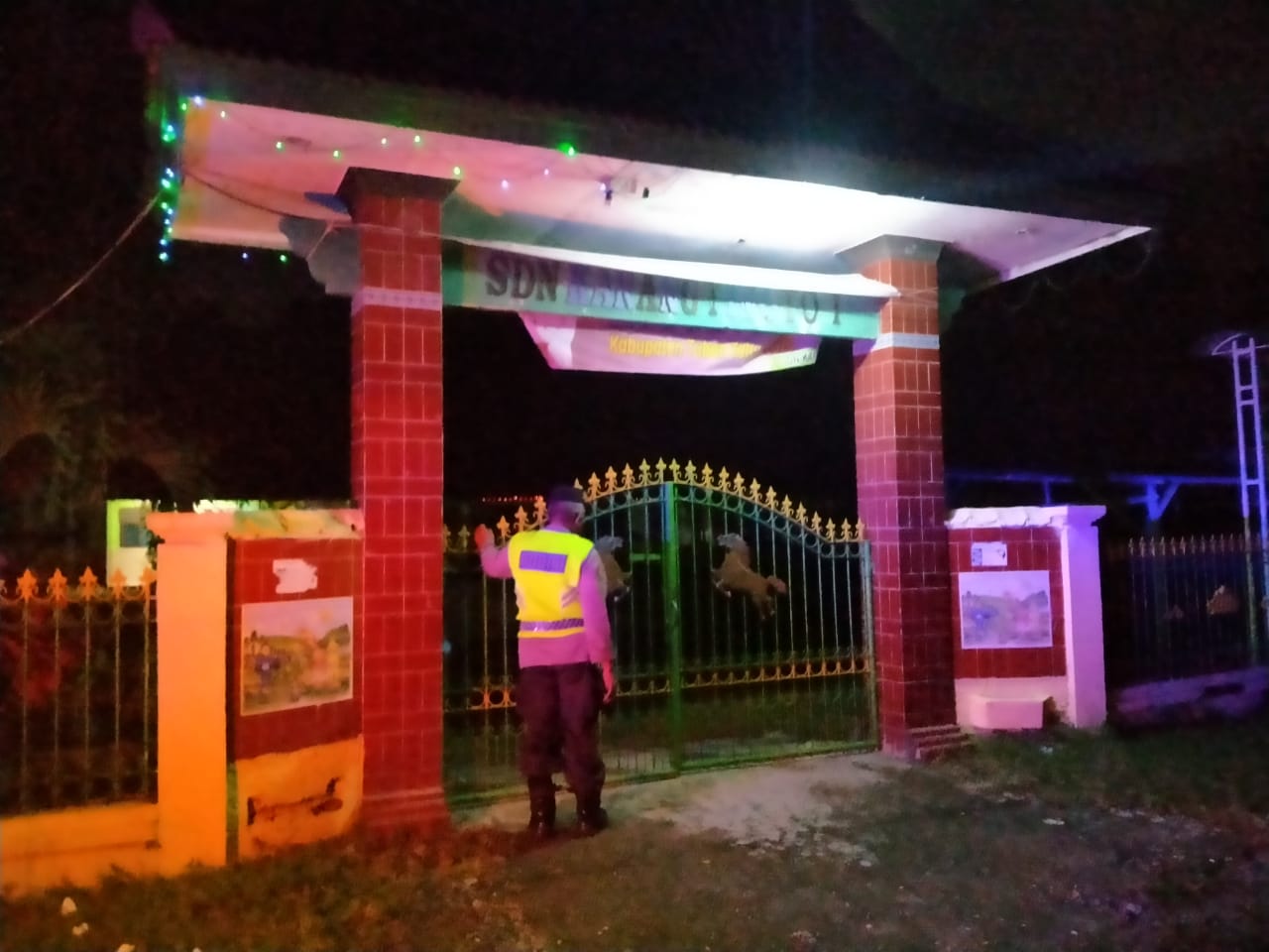 Pada kegiatan patroli kali ini, petugas menyambangi sejumlah gedung sekolah yang ada di desa-desa , salah satunya di SDN Karangtinoto Kecamatan Rengel Kabupaten Tuban. Rabu dini hari, (02/06/2021).