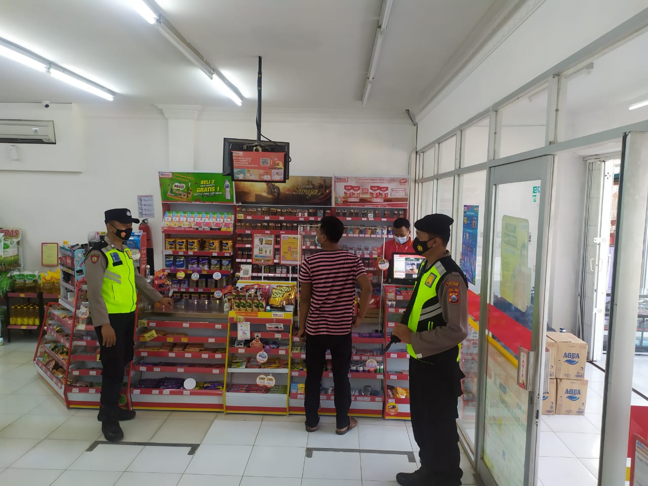 seopini.com-polrestubanpoldajatim Anggota Polsek jenu Polres Tuban Polda Jawa Timur, Bripka Aris dan Brigadir Samdo melaksanakan patroli di Minimarket guna memberikan himbauan kepada karyawan dan konsumen untuk menerapkan prosedur kesehatan serta antisipasi penjarahan oleh pihak yang tidak bertanggung jawab.