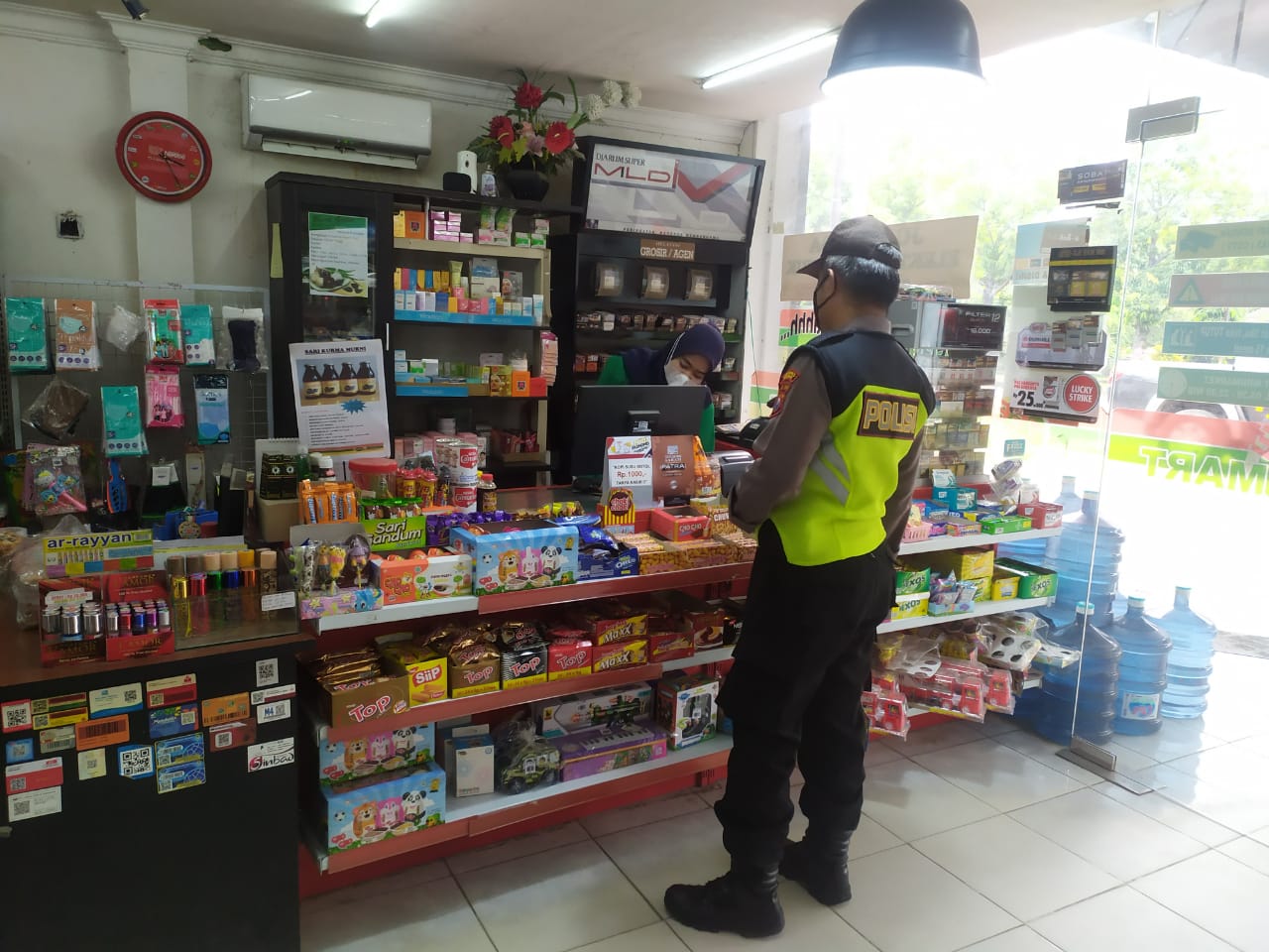 Polsek jenu Polres Tuban Polda Jawa Timur, Aiptu Bambang M dan Bripka Qorifal melaksanakan patroli di Minimarket guna memberikan himbauan kepada karyawan dan konsumen untuk menerapkan prosedur kesehatan serta antisipasi penjarahan oleh pihak yang tidak bertanggung jawab.