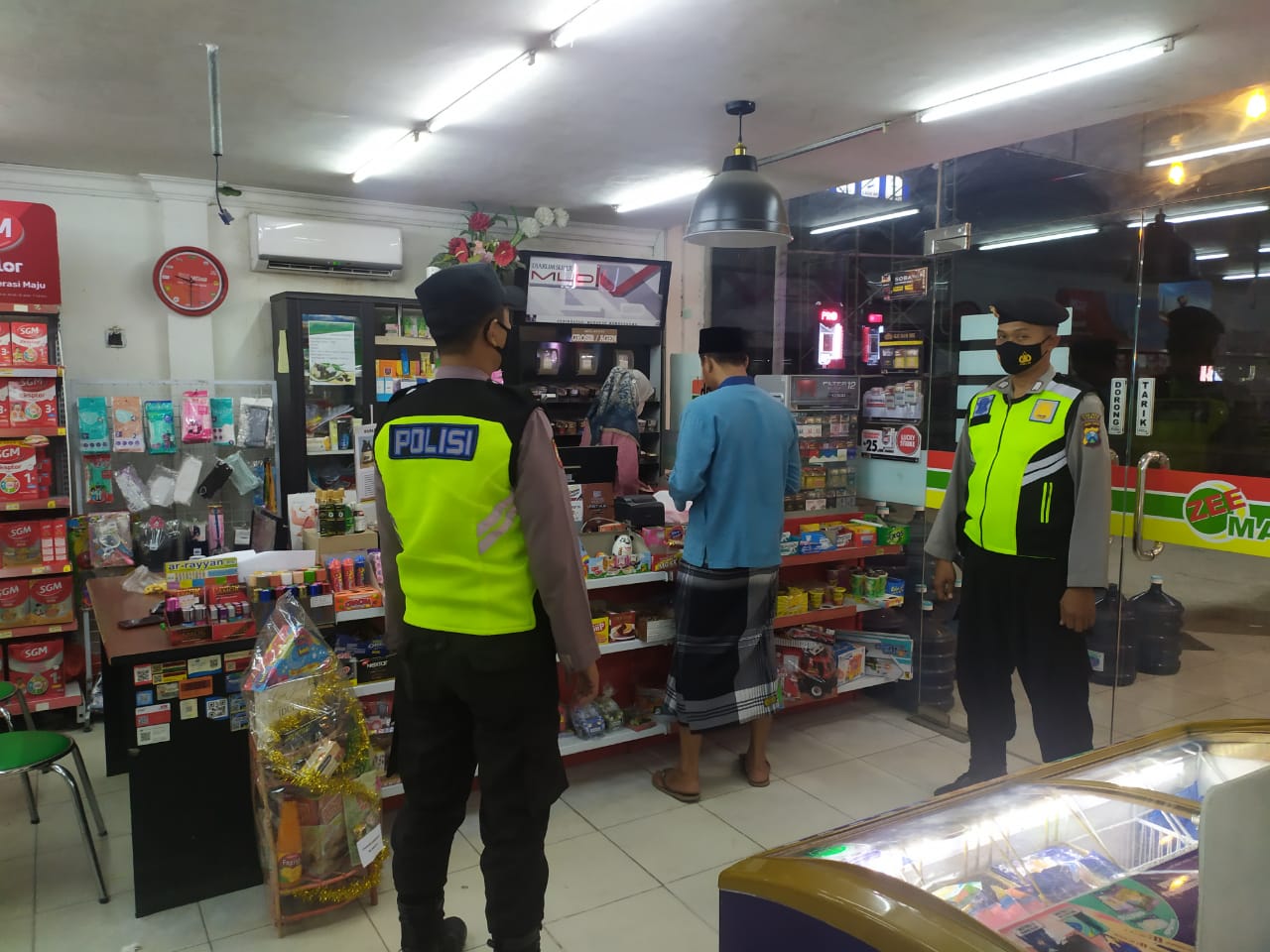 seopini.com – PolresTubanJatim Regu patroli polsek jenu Polres Tuban Polda Jawa Timur, Aipda Budi yuli melaksanakan patroli di Minimarket guna memberikan himbauan kepada karyawan dan konsumen untuk menerapkan prosedur kesehatan serta saat memarkir kendaraan di gunakan kunci tambahan.
