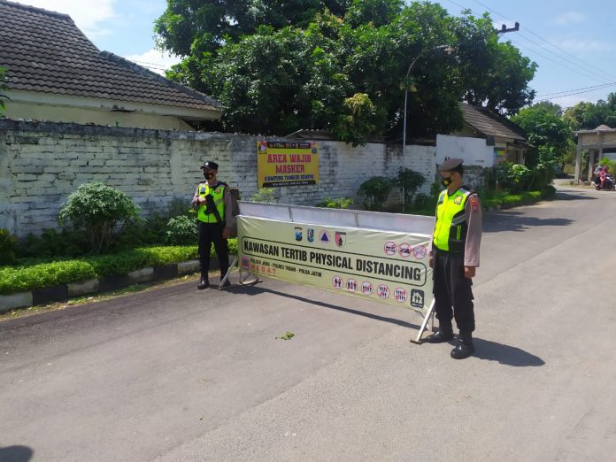 seopini.com-polrestubanpoldajatim Regu patroli polsek jenu, polres Tuban Brigadir Samdo dan rekan Koramil Jenu melaksanakan giat physical distancing di pintu masuk perum Jenggolo,di maksudkan untuk membatasi setiap aktivitas kluar masuk tamu yg akan memasuki wilayah tersebut. Ini di harapkan dapat meminimalisir penyebaran Covid 19 di wilayah perum Jenggolo pada khususnya dan tidak timbul cluster keluarga di wilayah jenu.