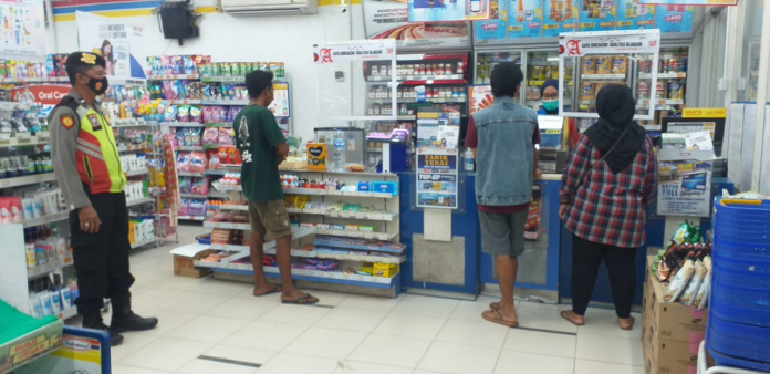 Polsek Tambakboyo Polres Tuban melaksanakan Himbaun protokol kesehatan (Prokes) di salah satu minimarket Indomart desa Tambakboyo Kec Tambakboyo Sabtu,(20/3/2021)malam
