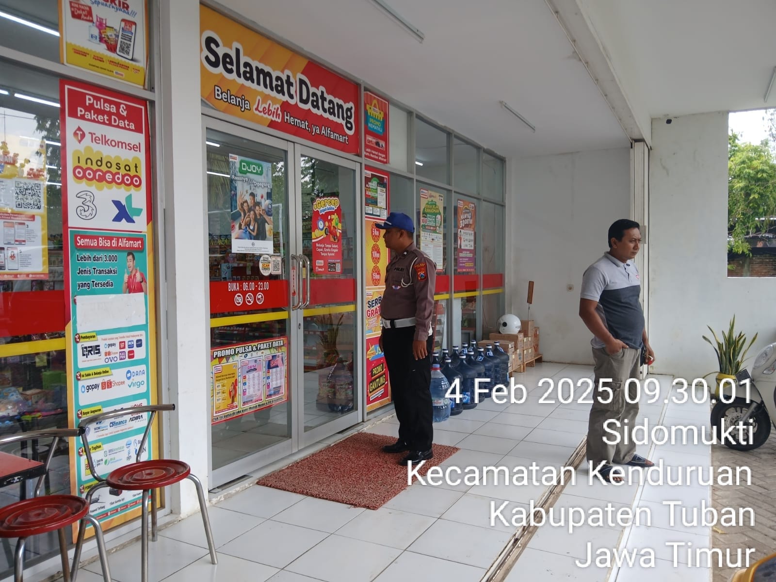 TUBAN, Kenduruan,- Giat rutin patroli ke Alfamart yang berada di Desa Sidomukti yang dilakukan oleh anggota Patroli Polsek Kenduruan Polres Tuban guna mengantisipasi curat, curas, dan curanmor (3C) maupun tindak kejahatan lainnya. Selasa (04/02/2025).