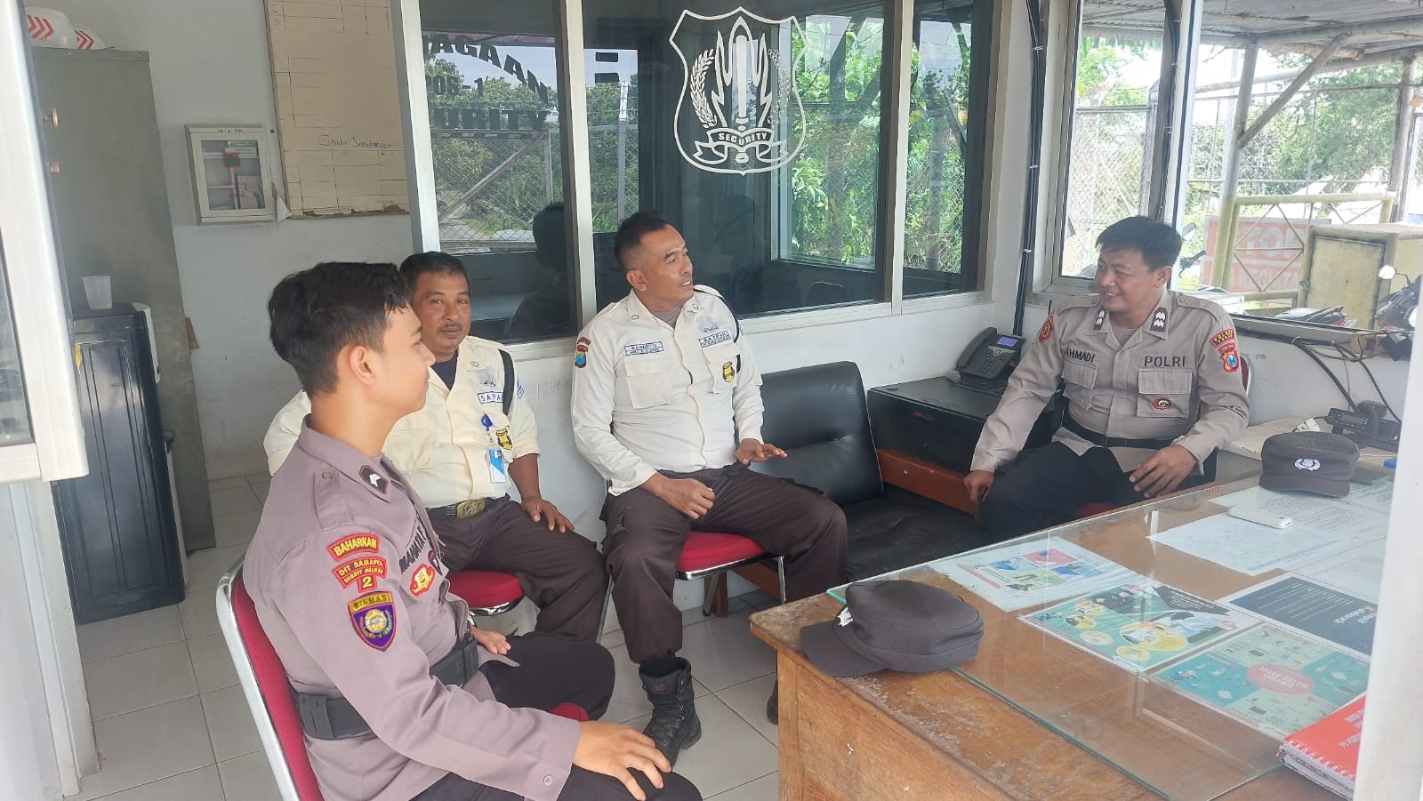 Senori – Ps Kanit Samapta Polsek Senori Polres Tuban Polda Jatim Aiptu Ahmadi bekerjasama dengan anggota Bhabinkamtimas Bripda Mahatta Flora Gimnasti melaksanakan patroli sambang di Pos Security PT. Pertamina Field Cepu Distrik Kawengan yang berlokasi di Desa Banyuurip Kec, Senori, Minggu (9/2/2025) siang.
