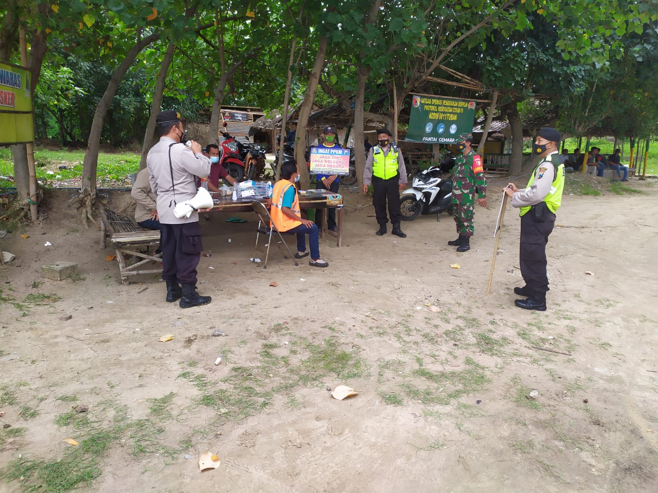 seopini.com-polrestubanpoldajatim Anggota polsek Jenu beserta anggota Koramil Jenu melaksanakan giat rutin patroli di tempat tempat keramaian serta menghimbau warga serta pengunjung tempat wisata untuk selalu mentaati protokol kesehatan serta penerapan 5M. Anggota polsek jenu mengecek kesiapan pengelola untuk menyediakan tempat cuci tangan maupun mengingatkan pengunjung untuk wajib menggunakan masker serta jaga jarak aman, menjahui kerumunan di setiap kegiatan, mengurangi mobilitas.