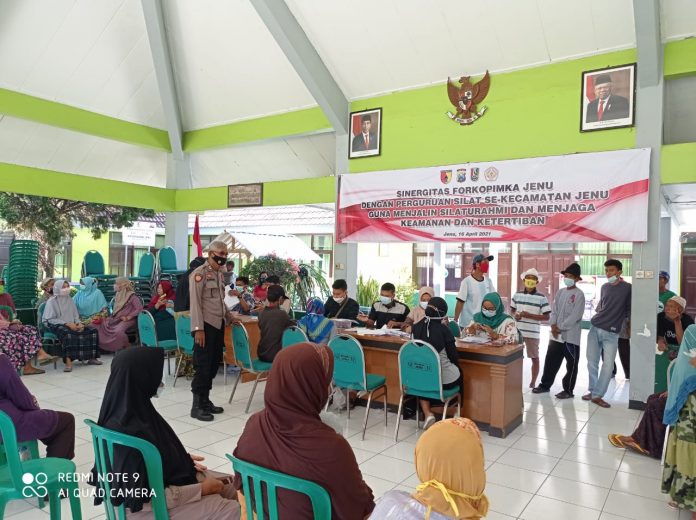 Polsek jenu polres Tuban melaksanakan giat pengamanan BST kemensos di 2 Titik baldes Purworejo dan kantor pendopo Kec.Jenu Minggu 18/04/2021.
