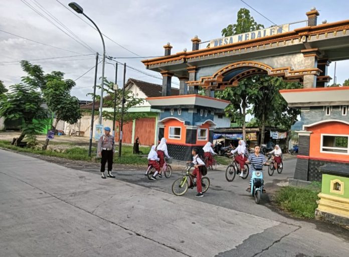 Senori – Dua Personil Polsek Senori Polres Tuban Polda Jatim Bripka Bibit Supono dan Bripda Khoirul Anam terlihat melaksanakan pengaturan arus lalu lintas dan membantu pelajar dan warga yang akan menyeberang jalan di simpang empat Desa Medalem Kecamatan Senori, Senin (10/11/2025) pagi.