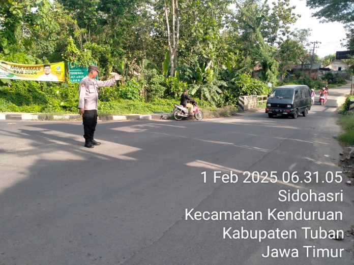 TUBAN, Kenduruan,- Kehadiran anggota Polsek Kenduruan Polres Tuban di bawah kepemimpinan AKP J. Mintoro dalam melayani masyarakat, salah satunya adalah melakukan pelayanan pagi hari terhadap Kamtibselcarlantas atau Keamanan, Ketertiban, Keselamatan, Kelancaran Lalu-Lintas, Sabtu (01/02/2025)