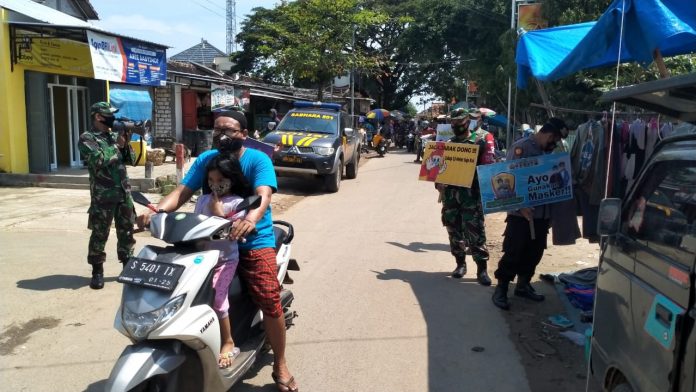 Pada kesempatan siang itu di lakukan oleh anggota Polsek Bancar bersama Koramil Bancar Melaksanakan giat YUSTISI Pendisiplinan Protokol Kesehatan dengan sasaran pengunjung Pasar Layur Ds Banjarjo kecamatan Bancar Tuban.