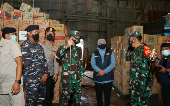 seopini.com – SURABAYA,- Forkopimda Jawa Timur Gubernur Jatim Khofifah Indar Parawansa, Pangdam V Brawijaya Mayjen TNI Suharyanto, Pangkoarmada II Laksda TNI I.N.G Sudihartawan bersama Kapolda Jawa Timur Irjen Pol Dr. Nico Afinta, didampingi Pejabat Utama (PJU) Polda Jatim serta Kabid Humas Polda Jatim Kombes Pol Gatot Repli Handoko, Kamis (15/4/2021) pagi, menyerahkan bantuan bahan kontak dan pelepasan KRI Tanjung Kambani-971, untuk penanggulangan Bencana Alam di Flores Timur Provinsi NTT.