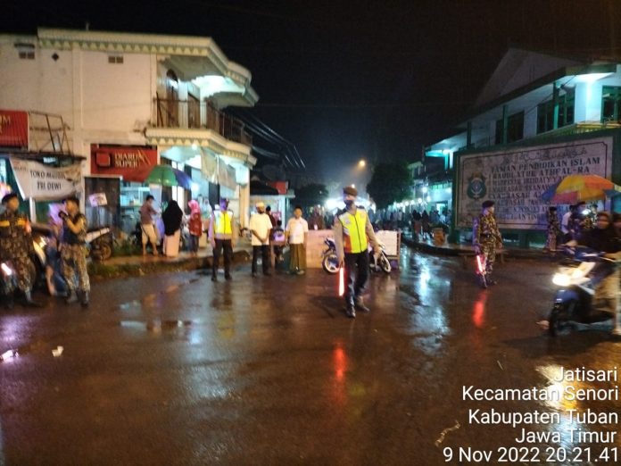 Senori – Personil Polsek Senori Polres Tuban bersama anggota TNI dari Koramil Senori dibantu Banser dari Satkoryon Senori, melaksanakan pengamanan kegiatan pengajian umum dan sholawatan yang diselenggarakan oleh Remaja Masjid (Remas) Raudlotul Sholihin Desa Jatisari Kecamatan Senori, Rabu (9/11/2022) malam.