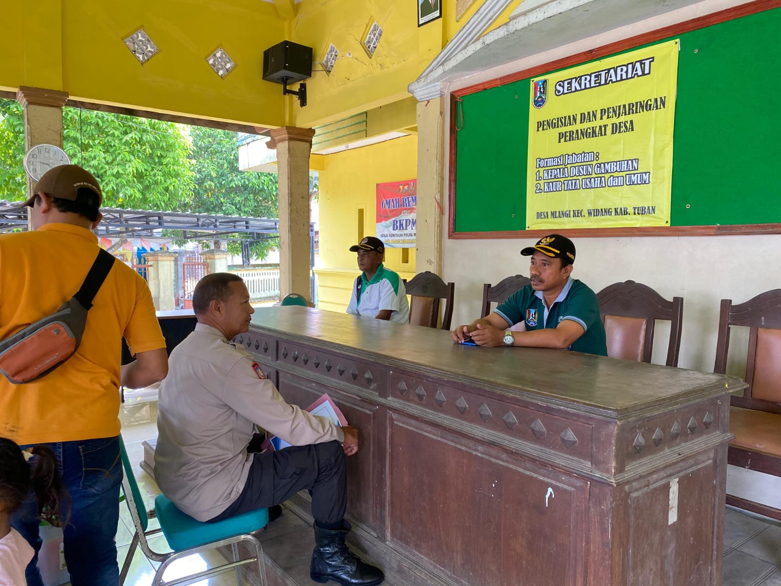 Tuban – Kanit Binmas  Polsek Widang Bripka Karjono kunjungan ke balai Desa Mlangi  dan memberikan pesan-pesan penting terkait penjaringan dan pengisian perangkat desa untuk memastikan proses berjalan aman, transparan, dan sesuai aturan.