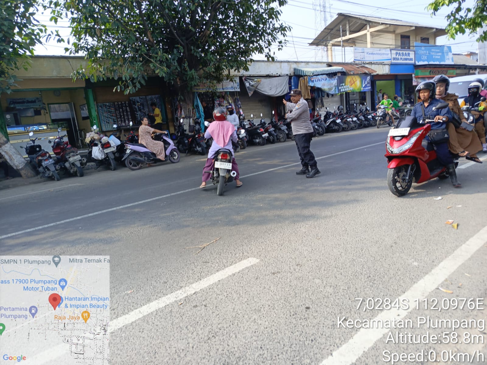 Situasi lalu lintas di kawasan tersebut cukup padat, mengingat banyaknya kendaraan yang parkir di sekitar pasar serta aktivitas jual beli yang tak pernah surut. Berkat kehadiran petugas, arus lalu lintas tetap terkendali meskipun kondisi jalanan ramai.