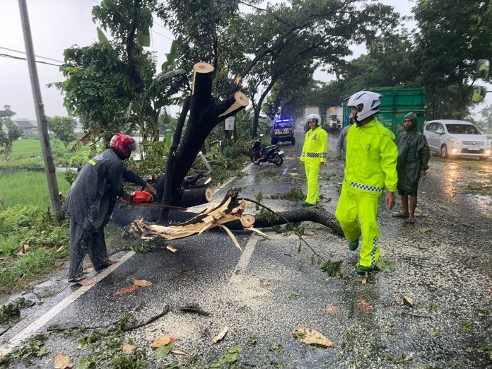 Tuban – Evakuasi pohon tumbang usai hujan angin di jalur poros penghubung Surabaya Semarang tepatnya di selatan Desa Compreng Kecamatan Widang Tuban Jawa Timur dilakukan anggota Polsek Widang bersama warga dengan memotong batang menggunakan gergaji mesin untuk menormalisasi lalu lintas dan membersihkan dahan anting, Kamis (26/3/2026) sore