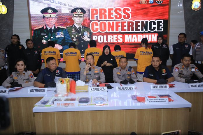 MADIUN – Satuan Reserse Narkoba Polres Madiun Polda Jatim berhasil membongkar jaringan peredaran sabu-sabu di wilayah Kabupaten Madiun. Empat pelaku dengan peran berbeda diamankan dalam operasi terpisah. Total barang bukti mencapai 1,1 kilogram sabu-sabu.Kapolres Madiun AKBP Kemas Indra Natanegara menjelaskan, penangkapan pertama dilakukan terhadap DS di tepi Jalan Raya Madiun–Ponorogo, Kecamatan Geger, Rabu (04/06/2025). Dari tangan DS, polisi menemukan 0,43 gram sabu-sabu.“DS ini pengguna. Dari pengakuannya, barang didapat dari NAR. Sorenya kami tangkap NAR di wilayah Kota Madiun dengan barang bukti sabu seberat 0,44 gram,” ujar AKBP Kemas saat konferensi pers di Mapolres Madiun, Jumat (08/08/2025).Dari hasil pemeriksaan, NAR disebut sebagai pengedar yang mendapatkan pasokan dari seorang kurir berinisial IIR. Setelah dilakukan penyelidikan, Polisi menangkap IIR pada Rabu (09/07/2025) di Jalan Yos Sudarso, Kota Madiun, dan DBP alias Kancil di Jalan Serayu, Kota Madiun.“Dari IIR, kami amankan tas totebag hijau berisi sekitar 1 kilogram sabu-sabu dalam kemasan teh China berlogo harimau emas, serta 100,68 gram sabu dalam plastik klip,” jelas AKBP Kemas.Selanjutnya petugas menangkap saudara DS yang berperan sebagai perantara/kurir dalam jual beli Sabu dari saudara IIR.Dalam keterangannya, IIR mengaku sudah empat kali menjadi kurir dengan bayaran Rp5 juta per pengiriman. “Barang dari Surabaya, mau dikirim ke Nglames. Uangnya untuk kebutuhan sehari-hari,” ungkapnya.Keempat pelaku dijerat pasal berbeda sesuai perannya masing-masing. Polisi juga masih mengembangkan penyelidikan untuk mengungkap bandar yang memasok narkotika tersebut.Kapolres Madiun mengimbau masyarakat untuk tidak ragu melaporkan jika mengetahui adanya indikasi peredaran narkoba di lingkungannya.“Sekecil apa pun informasi yang diberikan akan sangat membantu upaya pemberantasan narkoba,” ujar Kapolres Madiun.Dengan terungkapnya kasus ini, diharapkan jalur distribusi narkoba di wilayah Madiun dan sekitarnya dapat terputus, sekaligus menjadi peringatan bahwa aparat penegak hukum akan bertindak tegas tanpa kompromi terhadap pelaku peredaran narkoba. (*)